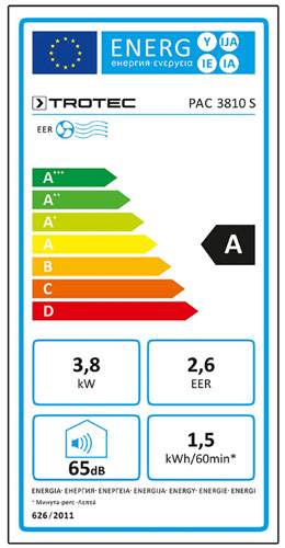 - Weiß-schwarzes Klimagerät in den Maße 37,5 x 50 x 28,5cm (BxHxT), 15kg Gewicht